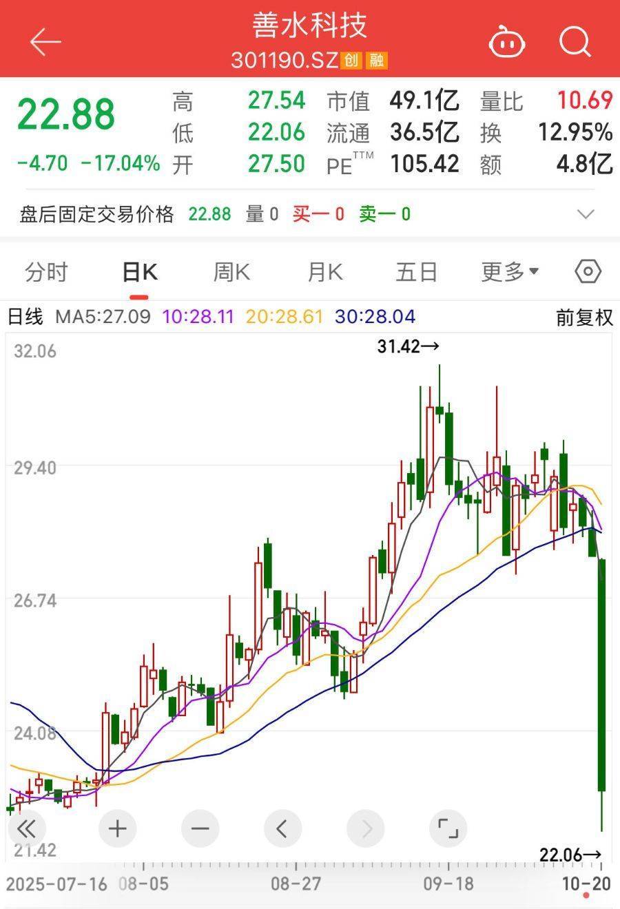 值得注意的是,尽管善水科技选择在收盘后才公告这一重大利空消息,但资本市场似乎有所预兆。10月20日当天,善水科技股价低开低走,盘中一度触及跌停。截至收盘,公司股价放量大跌17.04%,报22.88元/股。